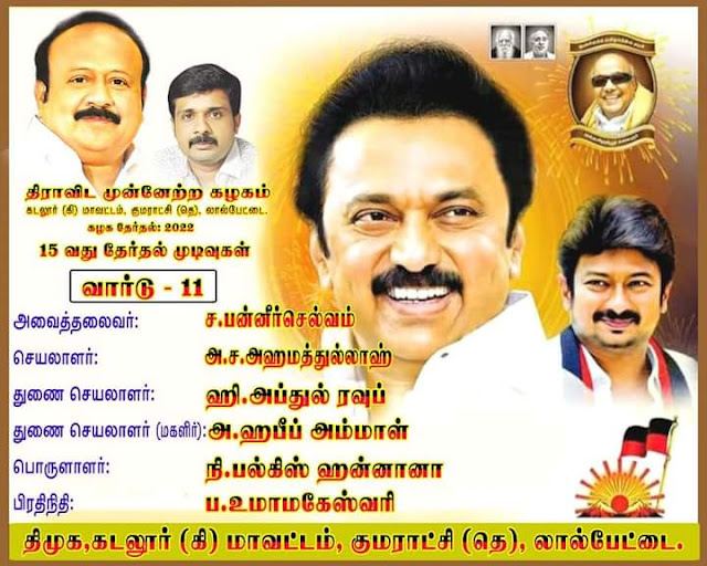 திமுகழக 15 வது பொதுத் தேர்தல் முடிவுகள் கடலூர் மாவட்டம் லால்பேட்டை பேரூர் சார்பாக தேர்ந்தெடுக்கப்பட்ட நகர மற்றும் கிளை கழக நிர்வாகிகள்.